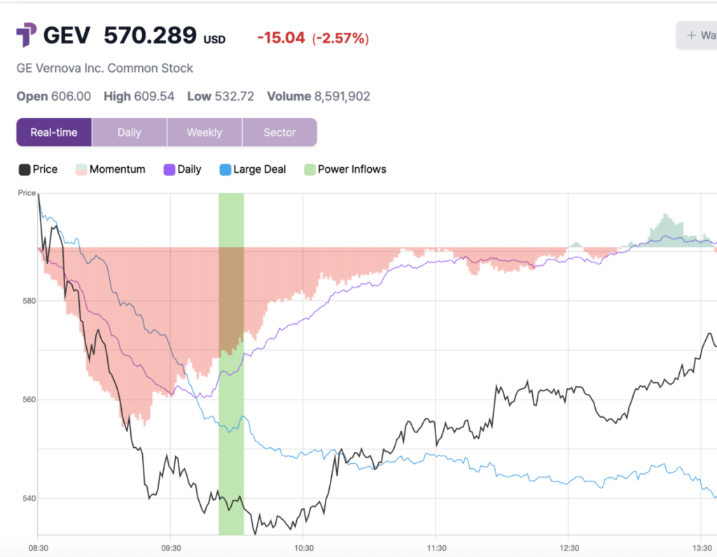 GE Vernova (NASDAQ:GEV) experienced a significant Power Inflow alert, a key bullish indicator that is closely tracked by traders who value order flow analytics, specifically institutional and retail order flow data.