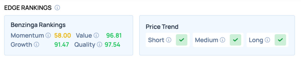 Toyota offers satisfactory Momentum and scores well across the Value, Growth and Quality metrics. It also boasts a favorable price trend in the Short, Medium and Long terms. For more such insights, sign up for Benzinga Edge Stock Rankings today!