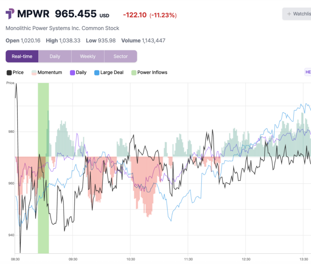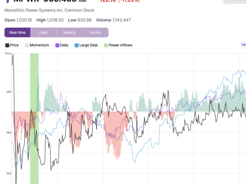 Monolithic Power Systems (NASDAQ:MPWR) experienced a significant Power Inflow alert, a key bullish indicator that is closely tracked by traders who value order flow analytics, specifically institutional and retail order flow data.