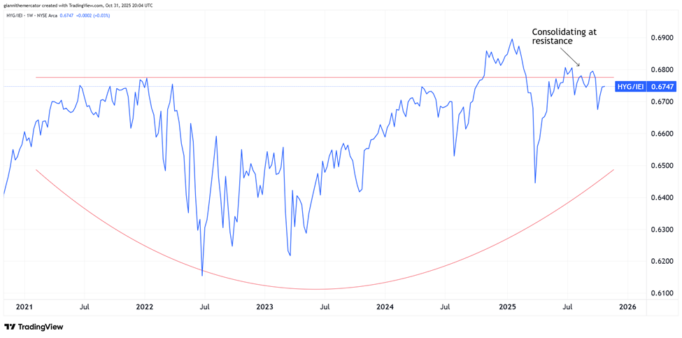 There's little reason to be concerned about a major market calamity as long as this ratio holds steady. Even less so if it starts to breakout from the saucer formation. Remember that credits tends to lead, and stocks then follow.