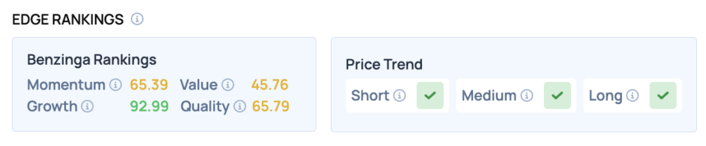 Benzinga Edge Rankings: Underscoring the stock’s new all-time high AMZN boasts a high Growth score of 92.99 and a positive price trend across all timeframes, according to Benzinga Edge Rankings.