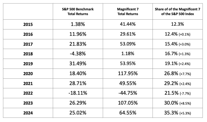 I don’t need to tell anyone that the stock market today is a very different entity than the one we had in 2012 when MOAT was first launched. In 2015, the Magnificent 7 (Apple, Amazon, Google/Alphabet, Meta, Microsoft, Nvidia, and Tesla) contributed just 12.3% of the S&P 500’s market cap. Today, they account for 36.6% with the returns of the Magnificent 7 ballooning in comparison to the S&P 500. In fact, the Magnificent 7 were responsible for over 50% of the S&P 500’s returns in 2023-2024, accounting for around 63% of the index’s performance in 2023 specifically.