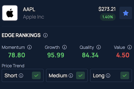 According to Benzinga's Edge Stock Rankings, AAPL scores in the 95th percentile for Quality and 84th for Momentum, underscoring its strong performance compared with industry peers.