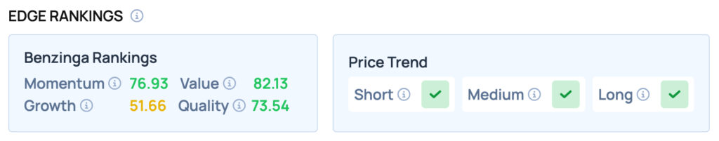 Ford scores well on Momentum, Value and Quality metrics, while offering satisfactory Growth. It also has a favorable price trend in the Short, Medium and Long term. For more such insights, sign up for Benzinga Edge Stock Rankings today!