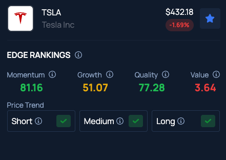 Benzinga's Edge Stock Rankings indicate Tesla stock has a Value in the 3rd percentile. Here is how the stock is ranked on other metrics.