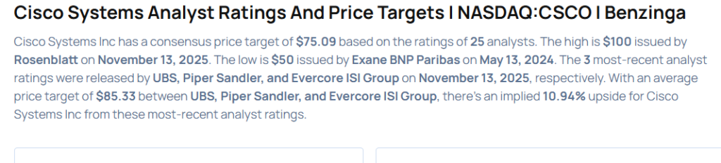 Cisco also raised its fiscal 2026 guidance. The company now expects full-year revenue of $60.2 billion to $61 billion, up from prior guidance of $59 billion to $60 billion. The company raised its full-year adjusted earnings guidance to a range of $4.08 to $4.14 per share, up from a prior range of $4.00 to $4.06 per share. Analysts are looking for full-year revenue of $59.68 billion and full-year earnings of $4.04 per share, per Benzinga Pro.
