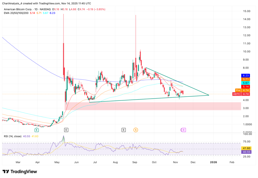 ABTC trades near $4.74 as the pattern compresses between rising support and falling resistance.