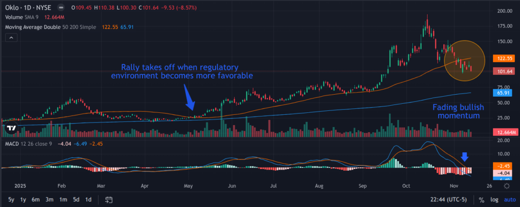 OKLO reported Q3 earnings on November 11th and missed expectations again, posting a loss of $0.20 per share, below the consensus analyst estimate of $0.13 per share. The company's most promising future projects aren't expected to generate revenue until late 2027 or early 2028, which is a long time for investors to wait for the potential of profits. Some appear to be getting restless, as the stock is down 40% in the last 30 days alone, and recently took out a key support level at the 50-day SMA. A classic ‘head and shoulders' pattern began forming in early September, and the stock has now broken below the ‘neckline' level that signifies a bearish trend. A bearish MACD crossover confirms this trend, and it may be a while before Oklo regains the momentum it had this summer.