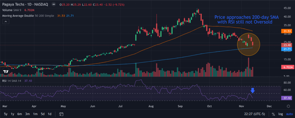 After using the 50-day SMA as support for most of Q2 and Q3, PGY shares breached it in September and immediately declined by more than 25% over just under two weeks. The stock is still up more than 150% year-to-date (YTD), but this recent decline has investors on edge. Like Oracle, the 200-day SMA will be a battleground for bulls and bears, but the Relative Strength Index (RSI) isn't flashing Oversold yet, a hint that the next move could be downward again.