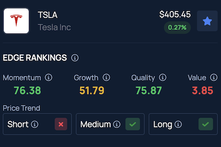 Benzinga's Edge Stock Rankings indicate the company is trending upward over the medium and long term, but dipping in the short term. Click here for a detailed comparison of Tesla's performance against its peers and competitors.