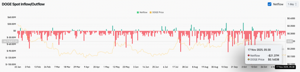 Outflows can sometimes signal accumulation, but in Dogecoin's case they align with risk-off positioning across major altcoins.