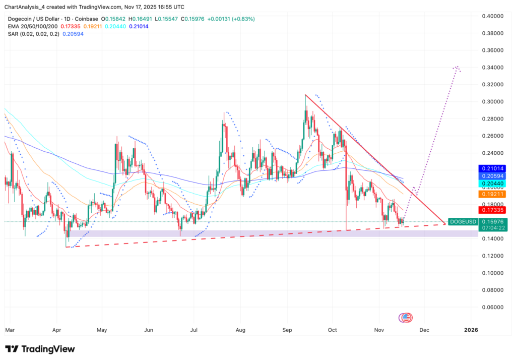 A confirmed close below the rising support near $0.145 would invalidate the bullish base that has carried Dogecoin throughout 2025 and expose the $0.13 zone.