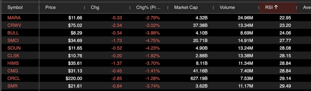 MARA Holdings, Inc.(NASDAQ:MARA) was the top result in the scan with an RSI of 22.95. (An RSI value of below 30 is generally considered to indicate that a stock is very oversold.) MARA stock has shed more than 40% over the past month as speculative tech names have taken a beating.