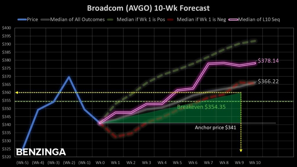 Using the KM-KDE approach mentioned above, the forward 10-week median returns of AVGO stock can be arranged as a distributional curve, with outcomes ranging between $327 and $382 (assuming an anchor price of $341). Further, price clustering would likely be predominant around $361.