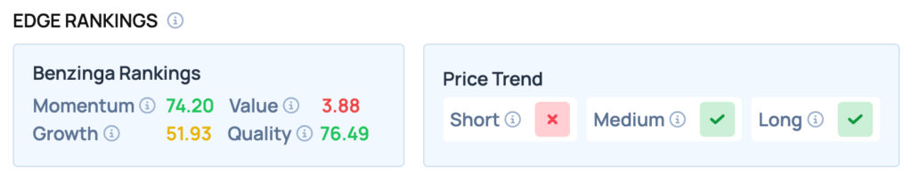 Tesla scores well on Momentum and Quality metrics, while offering satisfactory Growth, but poor Value. Tesla also has a favorable price trend in the Medium and Long term. For more such insights, sign up for Benzinga Edge Stock Rankings today!