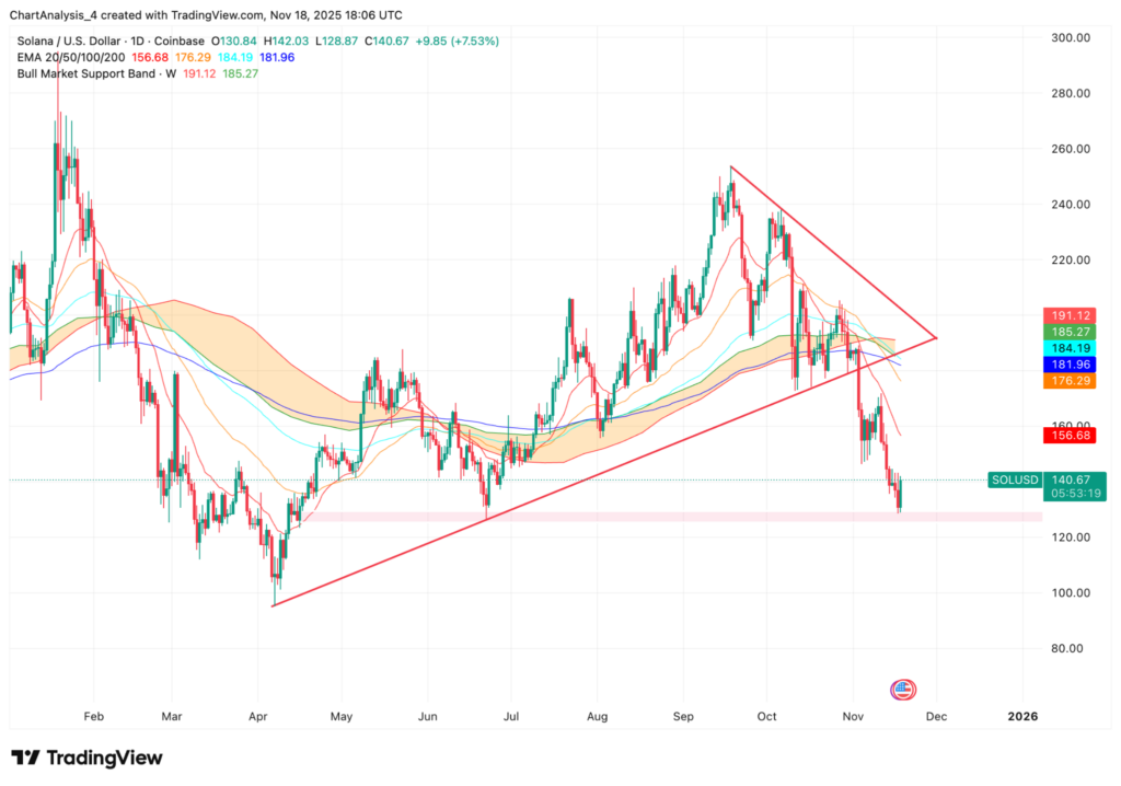 If Solana stalls at current levels, it risks another sweep of the $128 to $122 support zone.