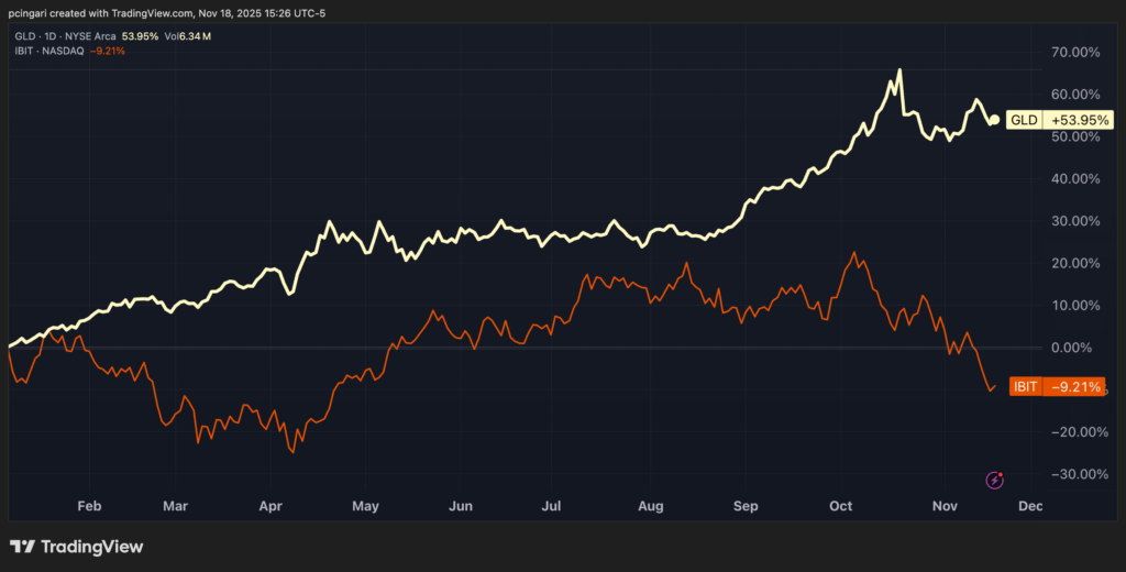 The SPDR Gold Shares (NYSE:GLD) has risen 54% year-to-date, while the iShares Bitcoin Trust ETF (NASDAQ:IBIT) is down 9%.