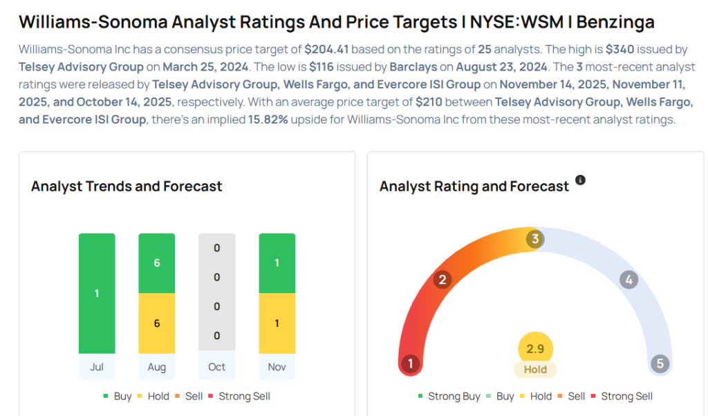 Analysts expect the San Francisco, California-based company to report quarterly earnings at $1.87 per share, down from $1.96 per share in the year-ago period. The consensus estimate for Williams-Sonoma's quarterly revenue is $1.87 billion, compared to $1.8 billion a year earlier, according to data from Benzinga Pro.