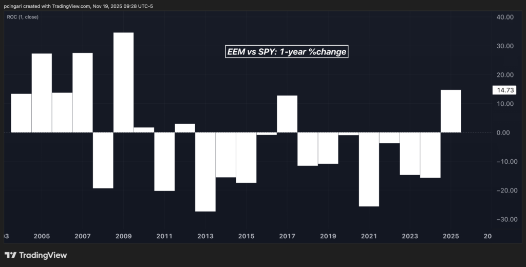 The iShares MSCI Emerging Markets ETF (NYSE:EEM) has gained 29% year-to-date, outperforming the SPDR S&P 500 ETF Trust (NYSE:SPY) by 15 percentage points—the biggest lead since 2009.