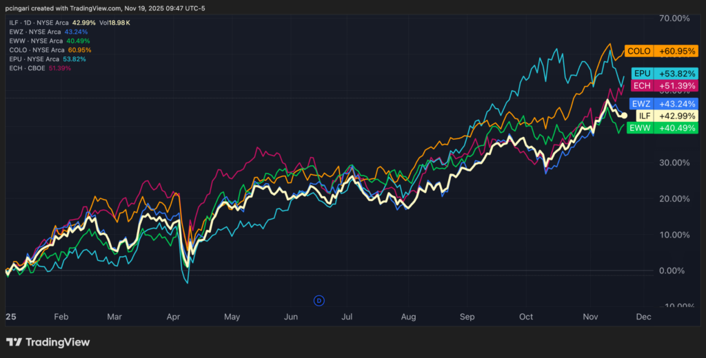 Country-specific funds have delivered blockbuster gains: the iShares MSCI Brazil ETF (NYSE:EWZ) and iShares MSCI Mexico ETF (NYSE:EWW) have risen 43% and 40%, respectively, while the iShares MSCI Peru and Global Exposure ETF (NYSE:EPU) soared 54%, the iShares MSCI Chile ETF (NYSE:ECH) added 51%, and the Global X MSCI Colombia ETF (NYSE:GXG) surged 61%.