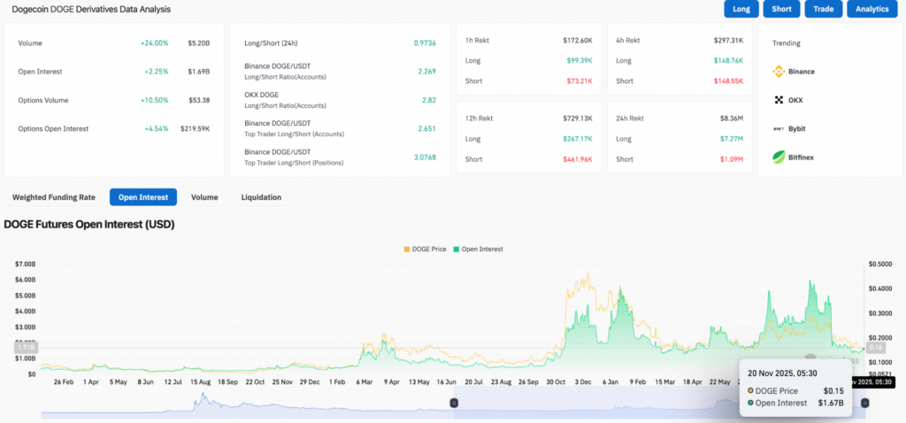 DOGE futures open interest currently sits near $1.67 billion, matching the broader trend of steady re-accumulation rather than capitulation.