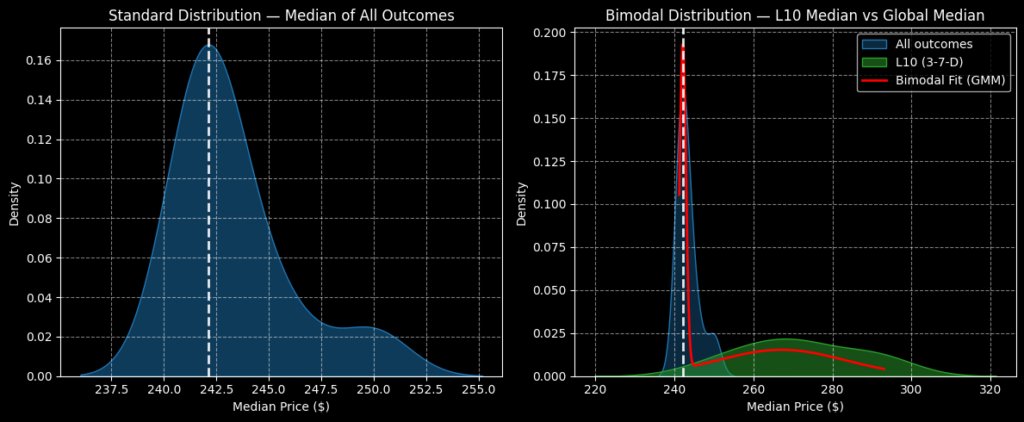 Using a Kolmogorov-Markov framework layered with kernel density estimations (KM-KDE), the forward 10-week median (nominal) returns can be arranged as a distributional curve, with outcomes ranging between roughly $237 and $255 (assuming an anchor price of $242.14). Further, price clustering would also likely be predominant around $242.