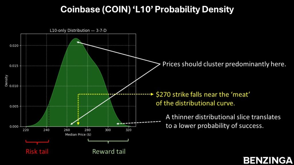 Since we have an empirical idea of where COIN stock is likely to cluster, it's much easier to formulate a plan. I'm looking at the 260/270 bull call spread expiring Jan. 16, 2026. This trade involves two simultaneous transactions: buy the $260 call and sell the $270 call, paying a net debit of $375 (the most that can be lost).