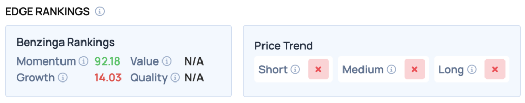 Benzinga Edge Rankings: Benzinga Edge stock rankings, which provide four key scores to help identify the strongest and weakest stocks to buy and sell, show Plug Power with a robust Momentum Score of 92.18 but a weak Growth Score of 14.03, while its short-, medium- and long-term price trends all remain negative.