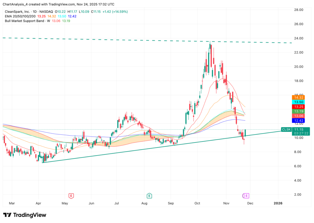 CLSK trades near $11.15, up about 14.6% on Monday, after rebounding from its long-term ascending trendline.