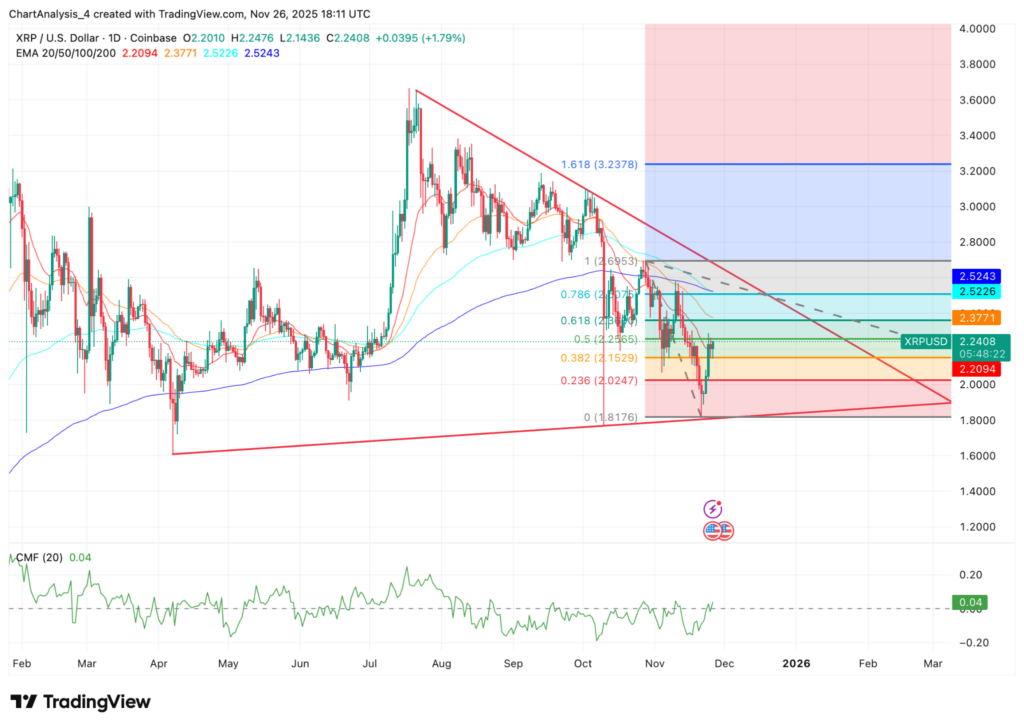 XRP price still faces a dense resistance band formed by the 50 EMA at $2.37, the 100 EMA at $2.52, and the 200 EMA at $2.52.