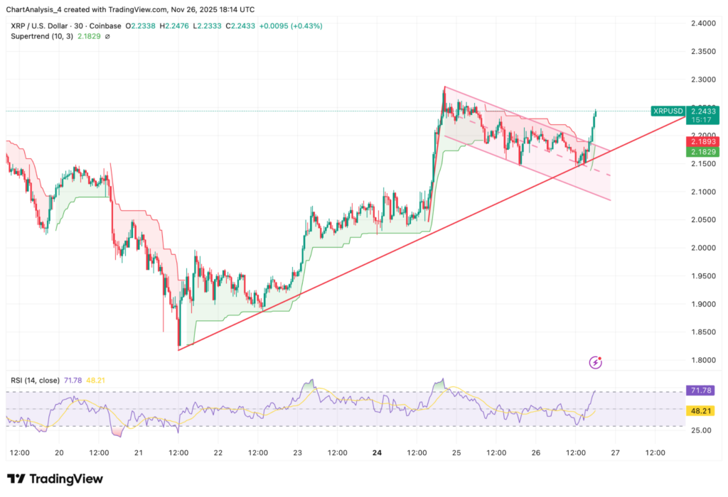 On the 30-minute chart, XRP broke out from a falling wedge and reclaimed its rising intraday trendline.